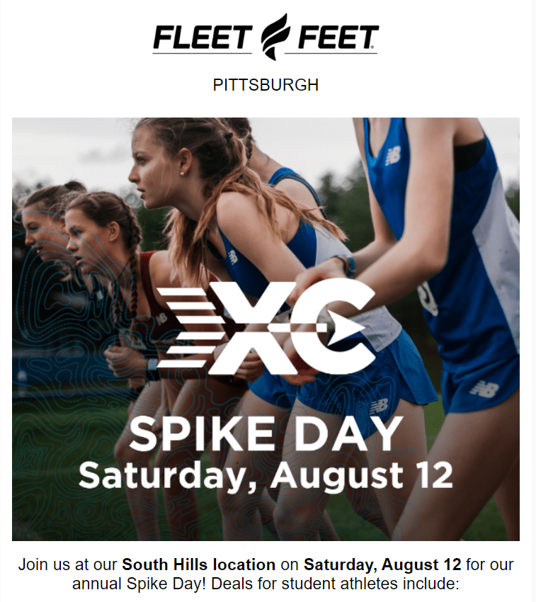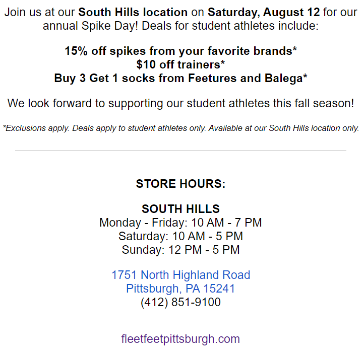 If your athlete needs spikes (or other running shoes) Fleet Feet is having their Spike Day this Saturday. Always great service!